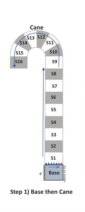 With RS of Base facing, transfer 6 sts on holder to needle, then, starting at yellow triangle on Figure 2, Step 2, pick up and knit 86 sts around outer edge of completed Cane (Note: stitch counts per stripe are provided in Figure 2).