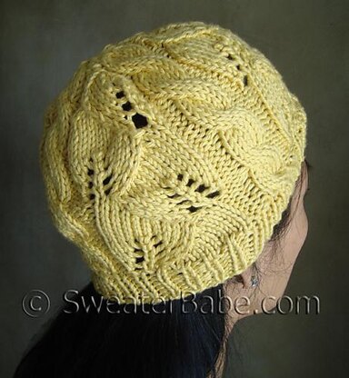 This hat is knit from the bottom up in the round, so it's seamless and quick! A simple ribbed border transitions into a pretty combination of classic cables alternating with a beautiful intertwining leaves lace design. Reverse Stockinette stitch makes for a nice contrasting background stitch.
