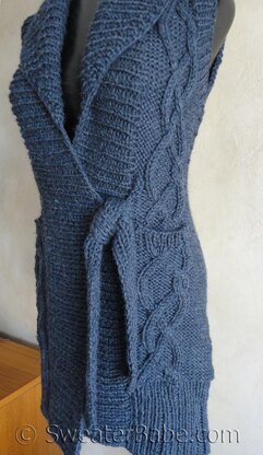 A beautiful, wide, interweaving cable design is the center motif on the back. The same cable design is cut in half and echoed on the fronts, which mirror each other. Wide ribbed front bands, knit-in pockets, and shaped shawl collar add to the sophistication.
