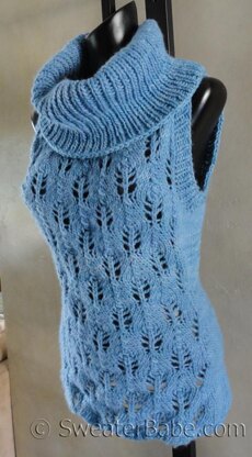 The Sleeveless Cowl is knit from the bottom up in one piece. The lace stitch is easy to work and creates a beautiful all-over open lace look, as well as a naturally scalloped hem. The waist is shaped to further emphasize the long and lean look.