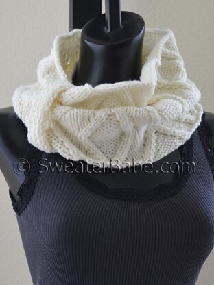 Knit this versatile cowl up quickly on size 10 ½ needles in the round, with a visually gratifying stitch that uses cable knitting techniques to create a pretty, embossed diamond design. A ribbed band gathers the cowl on one side for a perfectly-cinched look.