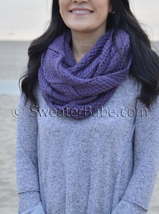 Textured diamond shapes bordered by eyelets comprise the overall stitch pattern in this beautiful infinity scarf.