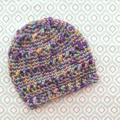 Crochet this little hat in a flash! Single crochet, a textured cross stitch, and a tiny little rib stitch combine for a sweet topper for your little one. The pattern uses less than a skein of yarn and is so quick and easy to make that you'll want to make several to have on hand as gifts.