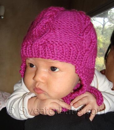 A cute round baby head deserves a fancy cabled hat like this to keep it warm. This one is knit in the round with a great diamond cable pattern that changes to a simple cable as it travels up the crown. Easy decreases and a ribbed border give it its great shape.