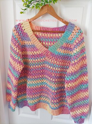 This Pullover is worked from the top down in one piece, using the granny stitch. It's quick and easy to work up and is great for using up scrap yarn.