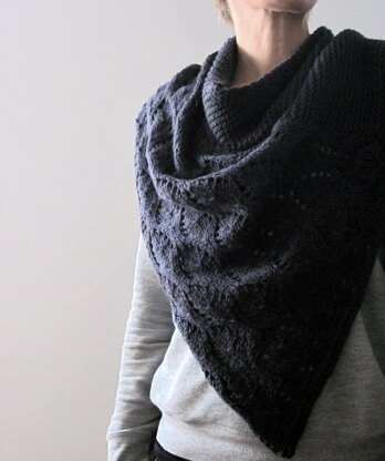 Ainu is worked from the narrow point of the left edge, increasing to full side of the right edge. Stitches are increased every RS row to full width of lace pattern, then incorporated in garter stitch to the end of the shawl.