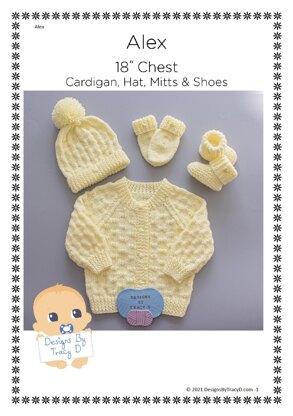 Alex is a Baby Knitting Pattern suitable for a boy or a girl and has a Cardigan, bobble hat (not shown) Square Pom Pom hat, Booties and Mitts and it is to fit a baby 18" chest (finished size) It is made using DK yarn with 3.35mm & 4mm needles, and has a very simple 8-row pattern. The full set will need 200g of DK yarn.