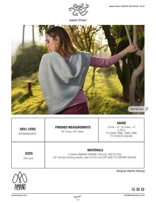 AMANO Isabel Shawl PDF is a Knitting pattern by Martha Wissing, available as a Downloadable PDF. Super fun to make, this pattern could be your next masterpiece!