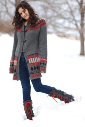 The Andokides Jacket is an unfitted, colorwork jacket that is worked from the bottom up, in the round in one piece. The sleeves are worked separately and joined to the body at the yoke. The front is steeked and button bands are added.