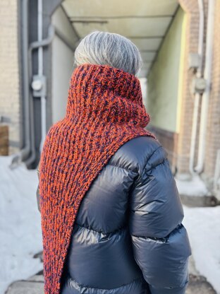 Aphelion is a long pointed cowl worked from the top down in Fisherman’s Rib. It is first worked in the round to create a tubular shape, and then is split and worked flat to make the front and back triangular points. The back and front points are shaped the same, so the finished cowl is reversible. The yarn is held double throughout the pattern in two colors to create a marled effect. It was originally published in Cosmology Daruma 2022. Pattern is written in English and Japanese.