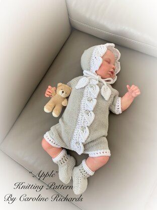 A pretty romper suit knitting pattern with leaf button band detail. The romper is knitted from the top down and the leaf button band is knitting in as you go, so no need to pick up stitches. The bonnet is knitted sideways with the leaf edge worked in as you go. The entire set is knitted using straight needles and has line by line instructions.