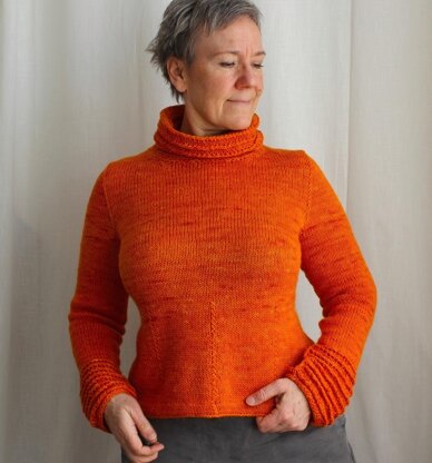 Arananja is knitted top down, winding its way back and forth in the usual Ziggurat manner. You get bold, textured cuffs with horizontal lines that play off the vertical cord detail going around the body. The cording below the waist allows you to sneak in extra increases for a more relaxed fit if desired.