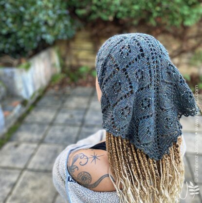 Construction infoThis diamond lace, beaded, triangular Headscarf is knitted from the top down, gradually growing in size. Follow the Diamond lace chart and apply beads where indicated. Finally, the whole piece is finished with a pretty Bobble-Picot bind off technique.