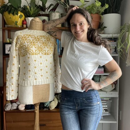 Autumn Chestnut is an autumn inspired ski sweater. A simple colorwork motif of little crosses and leaves on the yoke and body makes this sweater an instant classic that will effortlessly match with your wardrobe. Knit up in White Dog Farm VT’s yarn, a lovely worsted weight wool base available in small batches of beautiful hand dyed shades. Autumn Chestnut would be the perfect design to wear on the slopes or snuggled by a fire in the lodge!