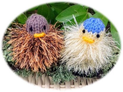 Knitted in minutes in one easy piece, using straight needles and leftover scraps of eyelash yarn and DK yarn. Baby Robins have brown speckled chests, their redbreasts grow later in the season. You can replace the eyelash yarn chest with a suitably coloured DK yarn if you prefer, for both Robin and Blue Tit.
