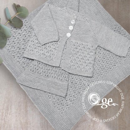 The jacket is worked in one piece from the top down, bodice and sleeves are worked in garter stitch with a simple all over pattern on the bottom section. No seaming involved. Blanket is worked in one piece, with a garter stitch border, then the all over pattern is worked on bottom, top and sides, the centre section is worked in garter stitch. This sweet little set would make the perfect baby gift, which would be treasured for many years to come. Pattern comes with schematic.