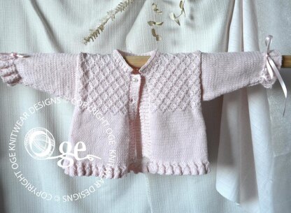 This pretty little girls jacket/sweater has beautiful detail on the bodice and a frilly cuff on the sleeves and hemline. Would also look beautiful knitted in plain white which could then be worn as part of a Christening outfit.