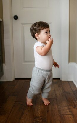 Every wee one needs this pair of perfectly comfy pants for lounging around the house, sneaking food from the pantry and maybe even creating a little mischief. • These bottoms are worked seamlessly from the top down. Simple short row shaping is included for plenty of room in the back. • Shown in 2 years with Baby Tee (pattern sold separately). Pattern is suitable for adventurous beginning knitters.