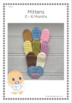 This is a knitting pattern for a collection of 8 pairs of Baby mittens, size 0-6 months, that only need 20g of yarn for each pair.