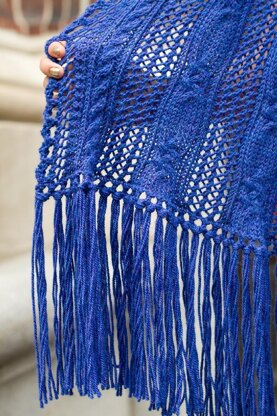 Back Bay is a large, rectangular, fringed wrap adorned with a combination of cables and lace. It is knitted in one piece with the edgings worked concurrently with the body. Fringe is added to eyelets at each end. Back Bay can be dressed up or down. Worn around the neck as a large scarf and paired with jeans and boots, it takes on a casual air. Draped around the shoulders as a shawl, it is elegant enough for a special evening out. Berocco Ultra Alpaca is at once drapey and warm. Any worsted weight yarn may be used, but be sure to work it at a gauge that gives the shawl the desired drape.