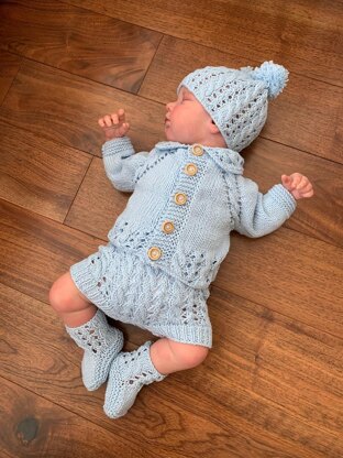 A lovely simple cable design 4 piece set. The pattern provides the instructions to make all 4 pieces of this set, The cardigan is knitted from the top-down on straight needles, The shorts, bobble hat, and little booties are all knitted in one piece from the bottom up and all have line-by-line instructions, making this set easy and quick to knit.