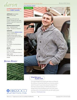 Berroco Daron is a masculine version of Rafik. Both are highly textured cardigans with easy knit and purl patterns, diamond cables and knit-in garter stitch button bands. Knit in Berroco Remix, this cardigan is perfect to use as a lightweight jacket! Daron is knit flat in pieces from the bottom up and seamed. Cable pattern is charted only.