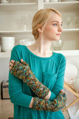 A simple lace pattern adorns the cuffs of the Berroco Biggs fingerless gloves, while the stockinette section keeps thumb shaping a breeze.