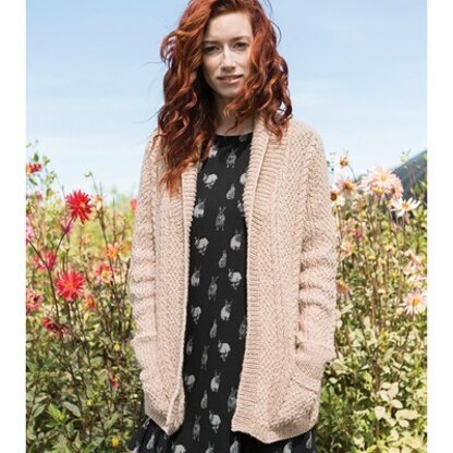 A cable and moss stitch cardigan, Astible is comfy and casual. The sweater is knit in pieces from the bottom up using Berroco Remix. Stitches are then picked up and knit for the front bands and collar.