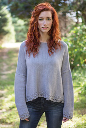 Coneflower is drop shoulder, oversized pullover with a pretty lace hem. Using Berroco Modern Cotton, Coneflower will be super-soft with great drape.