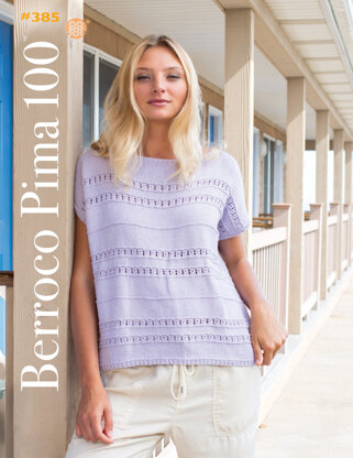 Chic summer style is what Berroco #385 Pima 100 is all about. The six designs in this collection include tops, sweaters, and shawls knit in Berroco Pima 100, a comfortable cotton yarn in a quick-knitting worsted weight.