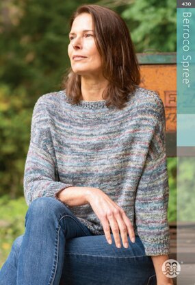 Berroco 430 Spree is a stunning collection of 6 lovely and must-have knitting patterns for a cardigan and tank set, short sleeve and long sleeve pullovers, a poncho, and a shawl. Spree by Berroco is a fabulous warm-weather yarn in a cotton and wool blend. The yarn uses an impressionistic spray-effect dye technique as the yarn showcases a lot of colors dappled throughout the ball.