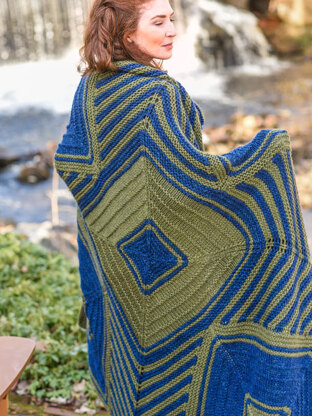 that is worked in the round from the outside in with panels of stripes picked up and worked out using Lanas Quick. Sections of the throw are joined by casing on and pickup up stitches, so there is no seaming involved. Lanas Quick by Berroco is a bulky weight 2-ply yarn. The heathering in this yarn adds a little interest to the bold colors in this line!