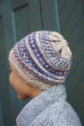 a colorwork hat and glove set that is knit in the round from the bottom up with