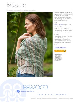 Berroco Briolette is a stunning women’s wrap knit in Spree. The shawl is knit from side to side in a lovely all-over lace pattern. The first ten stitches worked on every right-side row will be unraveled to form the fringe. Briolette is the perfect piece to tuck in your tote and have available to throw on when the temperature drops when you are out and about. Spree by Berroco is a fabulous warm-weather yarn in a cotton and wool blend. The yarn uses an impressionistic spray-effect dye technique as the yarn showcases a lot of colors dappled throughout the ball. The Briolette lace pattern is in chart form only.