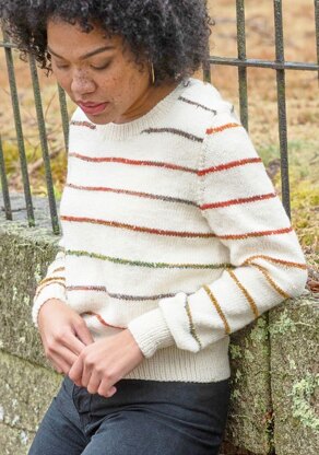 Berroco Bristow is a women’s classic pullover knit with fun Sesame stripes in a stockinette stitch Ultra Wool. The sweater is knit in the round from the bottom up to the underarm. The upper body and sleeve caps are knit back and forth, then seamed. Berroco Sesame is a colorful self-striping yarn with a subtle sheen and Ultra Wool
