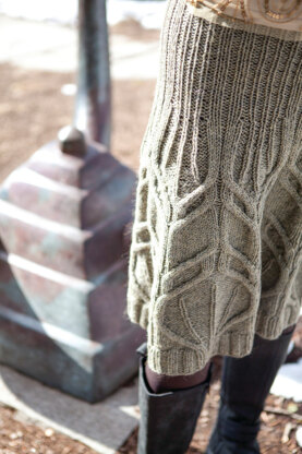 A wide ribbed waistband flows into a cascade of cables on Berroco Dickson, from Norah Gaughan Vol 13. This knee-length skirt is knit in the round from the top down in Ultra Alpaca yarn, making this a particularly soft & cozy skirt, in beautifully heathered colors. Cable patterns are charted only.