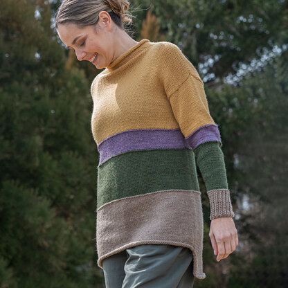 Bold colorblocking pairs with a cozy funnel neck in Dou Dizhu from the Berroco Portfolio Vol. 8 Collection. Berroco Ultra Wool is a smooth and warm superwash wool yarn that works up into garments that will stay looking and feeling great for a long time to come. Dou Dizhu is knit flat in pieces from the bottom up and seamed with an easy drop-shoulder fit and lower back hem for added coverage and warmth. Ultra Wool’s palette spans from subtle neutrals and soothing pastels to rich jewel tones and bold brights, making it a snap to find your favorites and to craft a sweater that just feels like you.