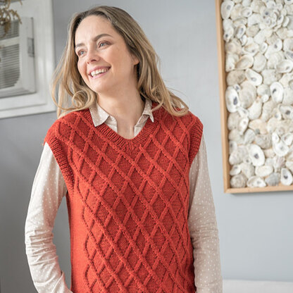 Sized for kids and adults alike, Euchre is a smart cabled vest from the Berroco Portfolio Vol. 8 Collection. From school and work to holidays or family pictures, Euchre is a great choice for adding warmth and polished style to a wide range of outfits. The timeless v-neck silhouette combines with a unisex fit to effortlessly layer over t-shirts, buttondowns, and dresses. This vest is knit flat in pieces from the bottom up and seamed with neck trim picked up and worked in the round to finish. Euchre is designed to work up beautifully in both Berroco Vintage and Berroco Ultra Wool, and these soft, machine-washable yarns both come in wide color ranges perfect for customizing to each person’s favorite! Cable pattern is both charted and written out.