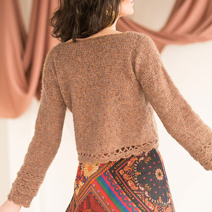 Berroco Kellar combines a vintage feel with a modern cropped silhouette for a crochet pullover that has a romantic style that's versatile enough for everyday wear. Kellar is crocheted in the round from the lace hem to the underarms, where the back and front are completed separately and seamed at the shoulders. Drop-shoulder sleeves are worked in the round to the wrist with layers of lace ruffles giving a distinct feminine style. Mistico yarn ensures that your finished sweater will be soft, warm, and lightweight with its unique blend of brushed alpaca halo and cotton, wool, and nylon core. Easy to wear on its own with skirts or jeans, Kellar is also a versatile layer that will top flowy dresses or tunics for extra style and warmth. Crochet lace pattern is both charted and written out.