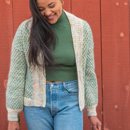 Pillowy soft and sporting a striking slip-stitch pattern, Berroco Muesli is a must-knit cardigan for your fall and winter wardrobe! This sweater has a versatility that will range from casual to elegant outfits, pairing as easily with tees and jeans as it does with dress pants and buttondowns. Muesli is knit with a strand of bouncy wool Lanas Light and a strand of fluffy Aerial or Aerial Color throughout, creating a finished fabric that is lightweight, cozy, and incredibly soft. Knit flat from the bottom up in pieces and seamed, this cardigan has a great balance of structure and drape. Choose Muesli for a layer that is always ready to grab and go to add warmth, color, and graceful style to any outfit. Slip-stitch pattern is both charted and written out.