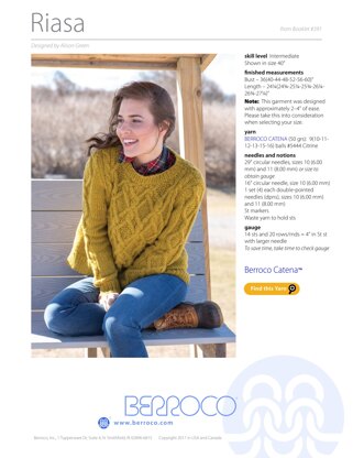 Berroco Riasa PDF is a Knitting pattern by Alison Green, available as a Downloadable PDF. Super fun to make, this pattern could be your next masterpiece!
