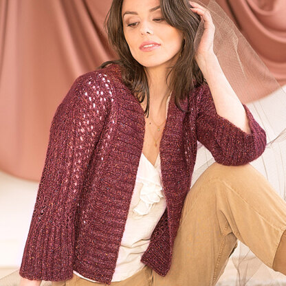 Berroco Sorcar adorns an open-front cardigan with eyelet lace columns and lightly belled sleeves for a versatile layer that will add style and warmth. Mistico pairs a colorful cotton, wool, and nylon core with a fluffy alpaca halo to create a yarn with lots of texture and interest that still lets your stitches shine and creates a lightweight finished sweater. Worked from the bottom up to the underarms in one piece, the front and back are finished separately and seamed at the shoulders. Sleeve stitches are picked up around the armhole and knit in the round to the cuff with a slight flare to the deep ribbed cuffs. A wide ribbed neckband completes Sorcar and leaves you with a cardigan that can elevate any outfit with its elegant look. Lace pattern is both charted and written out.