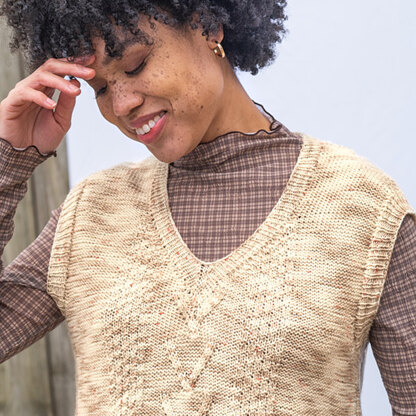 For flexible styling that will always be cozy and comfortable, Berroco Spruce Hill has got you covered! This vest is knit in smooth and soft Fika yarn, a superwash Merino wool available in speckled and space-dyed colorways to add that extra dash of something special to your finished projects. Spruce Hill is knit flat in pieces from the bottom up and seamed with tidy ribbed trims added during finishing. A center cable panel on the front pops against a reverse stockinette background and textured columns, and gives a lovely focal point that flows into the v-neckline. Layer this vest over turtlenecks, tees, and buttondowns and watch it effortlessly elevate any of them while keeping you cozy! Cable pattern is both charted and written out.