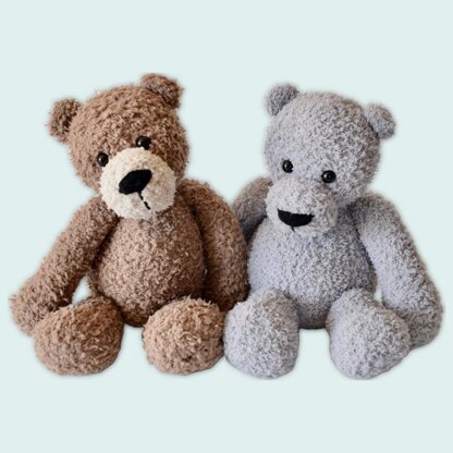 This teddy bear is knitted in a snuggly fleecy yarn to make it extra cuddly! Designed by Amanda Berry @fluffandfuzz, the bear is knitted in boucle DK yarns on single pointed needles (not in the round). Both grey and brown bears pictured follow the same pattern, just in different colours. For confident beginners and above, techniques used include casting on and off, knits, purls, kfb increase and k2tog decrease, and seaming to finish
