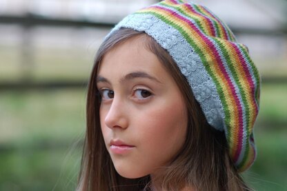 This beret features a braided cable brim. Body is worked in stockinette with an optional stripe pattern. Decreases are worked gently for a swirling super-slouch. Cabling on brim creates extra elasticity for a fit that won’t fall down over the eyes. Shown on model in size Adult Small.