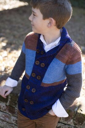 From toddler to teen, this vintage inspired garter stitch cardigan features a modern colorblock design that can be simplified by working solid. • Cardigan is worked from the top down seamlessly with only button attachment for finishing work. Shawl collar and buttonband are worked alongside the body. • Colorblock pattern is recommended for knitters ready to work intarsia; solid version is suitable for beginning knitters. Shown in size 2 (solid) and size 10 (colorblock). Check out the women’s version of this design, Big Sister.