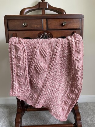 Celebrate a new life with this beautiful heirloom baby blanket! This design features big and little popcorn hearts framed by rows of crocheted cables and panels of popcorns and trimmed using eyelet crochet. The textures to see and touch will interest baby's senses again and again!