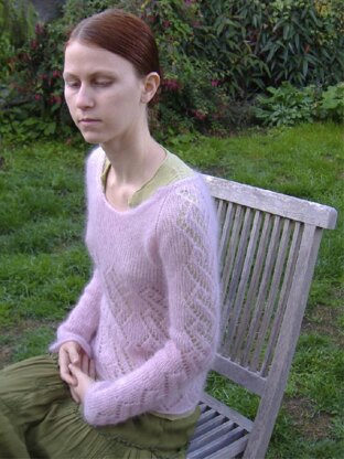 This is a light-weight but warm mohair lace pullover worked seamlessly bottom-up in the round with raglan shaping. The construction is simple with very little shaping. It includes a row of single crochet as a neck edge and grafted underarms.