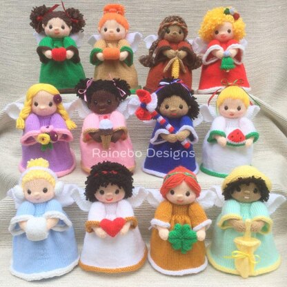 These 12 Birth Month Angels are knit in the round, using Magic Loop or double pointed needles. The base/body, arms and head are all knit on as you work along. They are approx. 7 ½” tall (without hair) and are created using #3-light wt. (DK wt.) yarn. These darling Angels are free-standing on a weighted, flat base and hold an accessory that reflects the month. They will make a lovely birth month remembrance for a special someone! Approx. yardage: Body Color: 40 yds. Main Color: 120 yds. Contrast Color: 20 yds. Wing Color: 30 yds. Accessories: Small Amounts... Inner Weight Object or Weighted Stuffing Beads, Crochet Hook (for attaching hair), 2” diameter Plastic Canvas Circle (could be cut from rectangle piece), Embroidery thread or yarn for mouth & nose, Safety Eyes: 8mm or embroidery thread/yarn, Jingle Bell, Ribbon, Plastic Drinking Straw, Buttons, etc.