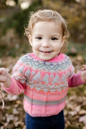 Sweetness for your loving little one. • This mini-sized version features everything fabulous from the adult Lovebirds Sweater design including two distinct body and sleeve style options, along with short and long sleeve instruction. It is worked seamlessly from the top down with a circular yoke and neckline is shaped with short rows. Colorwork and increases are charted and sweater is set off with Tubular hems (instructions provided). • Pattern is written for experienced knitters comfortable with longer floats. Shown in Size 18 mo with approximately 2”/5 cm positive ease.